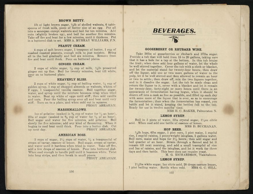 The recipes from this book were contributed to the Patriotic Society from around the region. Chapters include food items like biscuits, soups, "made up dishes" and egg dishes, but there are also chapters about beverages, sauces and "miscellaneous" - with entries like homemade floor polish, soap, waterproof dressing and cough mixture. Alongside these recipes, there are many interesting advertisements from the local businesses of Palmerston North.