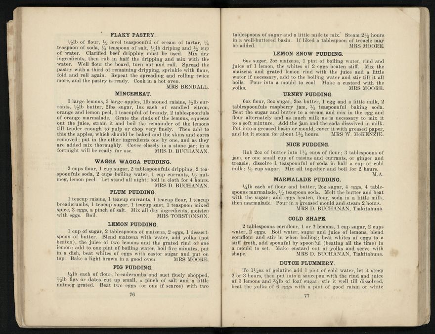 The recipes from this book were contributed to the Patriotic Society from around the region. Chapters include food items like biscuits, soups, "made up dishes" and egg dishes, but there are also chapters about beverages, sauces and "miscellaneous" - with entries like homemade floor polish, soap, waterproof dressing and cough mixture. Alongside these recipes, there are many interesting advertisements from the local businesses of Palmerston North.