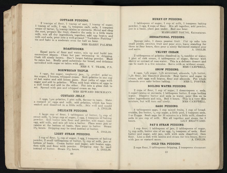 The recipes from this book were contributed to the Patriotic Society from around the region. Chapters include food items like biscuits, soups, "made up dishes" and egg dishes, but there are also chapters about beverages, sauces and "miscellaneous" - with entries like homemade floor polish, soap, waterproof dressing and cough mixture. Alongside these recipes, there are many interesting advertisements from the local businesses of Palmerston North.