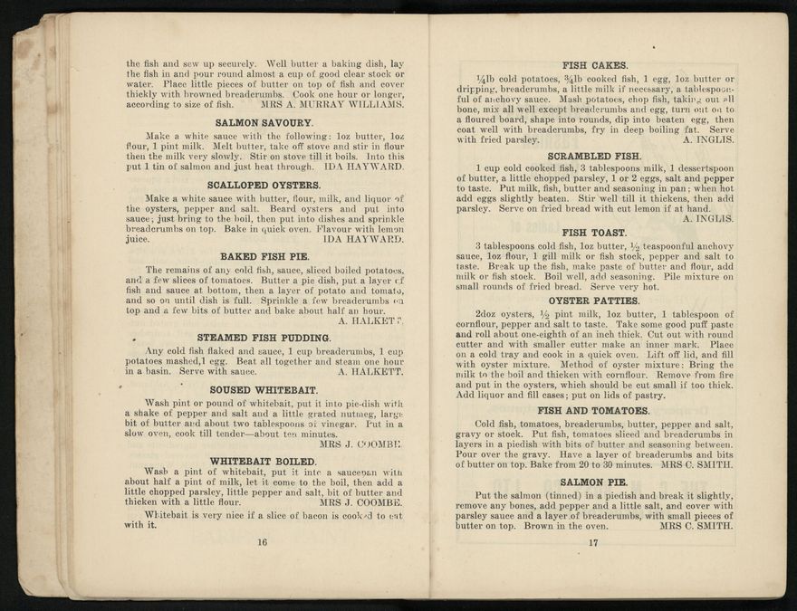 The recipes from this book were contributed to the Patriotic Society from around the region. Chapters include food items like biscuits, soups, "made up dishes" and egg dishes, but there are also chapters about beverages, sauces and "miscellaneous" - with entries like homemade floor polish, soap, waterproof dressing and cough mixture. Alongside these recipes, there are many interesting advertisements from the local businesses of Palmerston North.