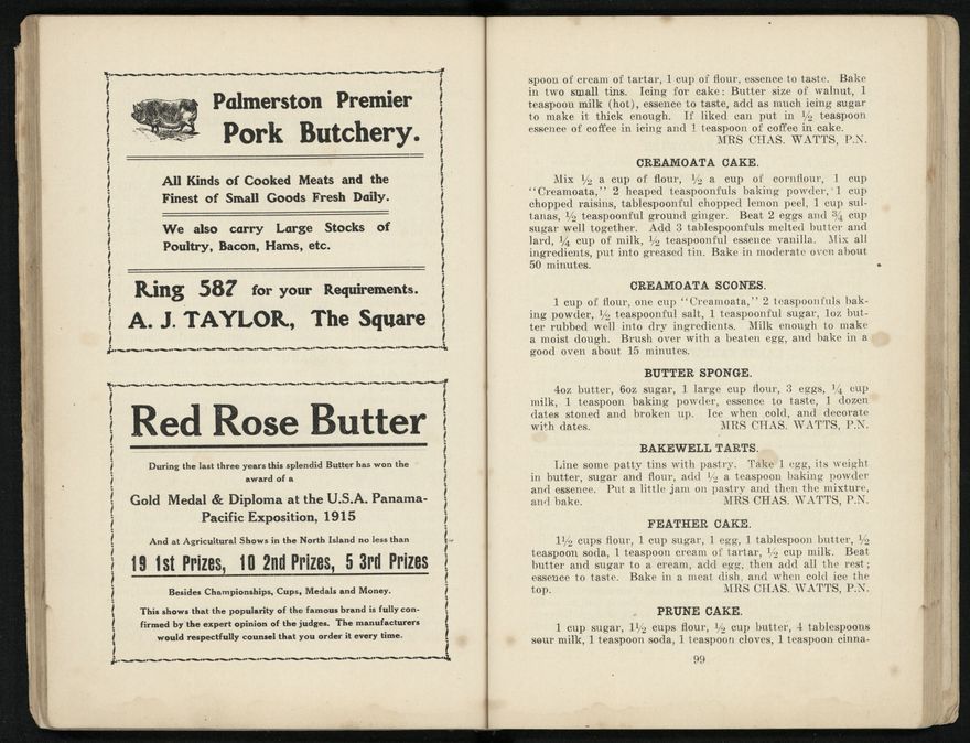 The recipes from this book were contributed to the Patriotic Society from around the region. Chapters include food items like biscuits, soups, "made up dishes" and egg dishes, but there are also chapters about beverages, sauces and "miscellaneous" - with entries like homemade floor polish, soap, waterproof dressing and cough mixture. Alongside these recipes, there are many interesting advertisements from the local businesses of Palmerston North.