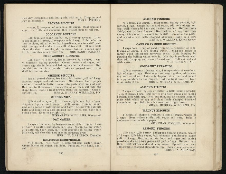 The recipes from this book were contributed to the Patriotic Society from around the region. Chapters include food items like biscuits, soups, "made up dishes" and egg dishes, but there are also chapters about beverages, sauces and "miscellaneous" - with entries like homemade floor polish, soap, waterproof dressing and cough mixture. Alongside these recipes, there are many interesting advertisements from the local businesses of Palmerston North.
