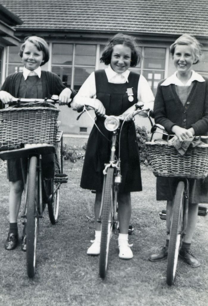 From left: Patricia Treweek; Patricia Hayes (later Eaton); Susie French, Form 1 pupils in their school uniforms at Palmerston North Intermediate Normal. Pat Hayes is wearing her House Captain badge.