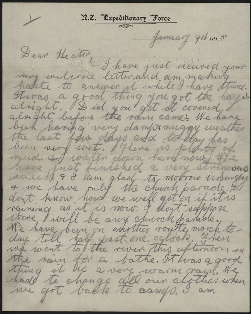 Pat (Percival) Argyle (1890-1915) was the son of Henry and Alice Argyle of Bunnythorpe. This letter is from Pat to his younger brother, Hector, from the Trentham Military Training Camp, where they are training before departure overseas. The letter tells about what life is like for them.