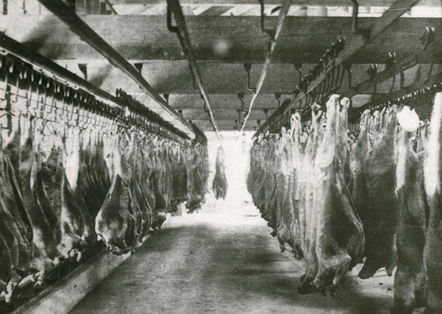 Carcasses hanging in one of the freezer units at the Longburn freezing works.