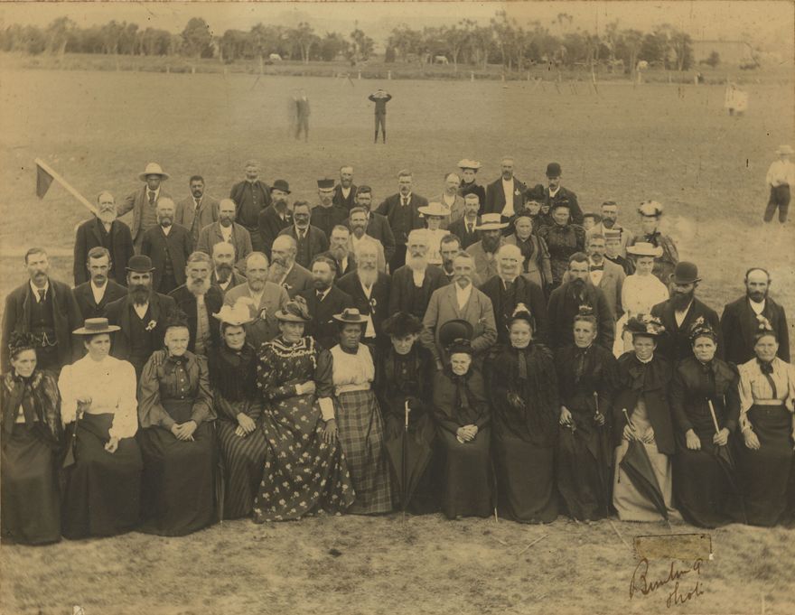 Early settler's picnic held in 1896 at the Manawatū Polo Club's grounds in Hokowhitu. The bush line of the Papaioea clearing can be seen behind. Woman, direct centre of front row: Identified as Catherine Richardson nee Lynch