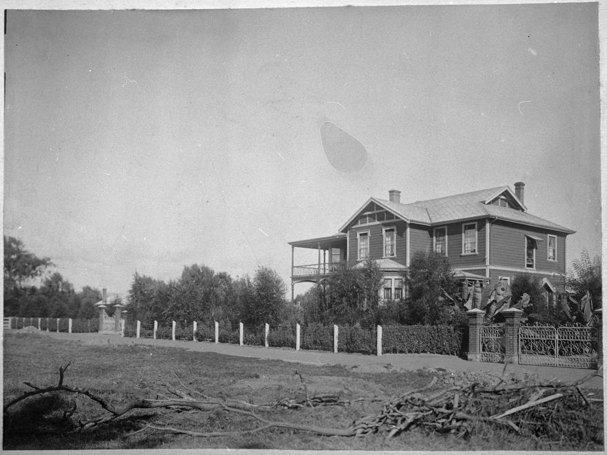 The view of the house on South Street. In 1910 William Park sold “The Wattles' and went to live in a newly constructed 18 room house further along College Street. He named this house, on Section 976, “Te Mahoe”. It stood on the western corner of South Street and College Street. In Mr Park’s time South Street was a cul-de-sac from Ferguson Street and the driveway to “Te Mahoe” ran along the site of the present College Street end of South Street. Mr Park sold the house to the Board of Governors of the Palmerston North High School, and from 1925 to 1938 the building was used as a hostel by Palmerston North Girls’ High School. During World War Two it was occupied by the Army and shortly after the war, about 1950, it was demolished to make way for State houses.