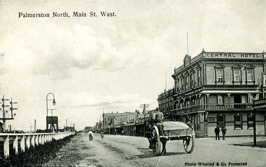 Cart and horse driving down Main Street from The Square, beside the railway yards. The Central Hotel at right was built in the 1890s on the corner of Andrew Young Street and Main Street (having relocated from The Square). The business continued until 1969.