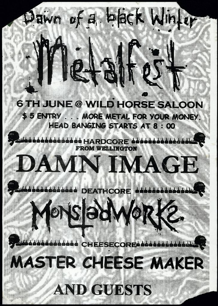 Dawn of a black winter. Metalfest. 6th June @Wild Horse saloon. $5 entry...more metal for your money. Head banging starts at 8:00. hardcore from Wellington. Damn Image. Deathcore. Monsladworks. Cheesecore. Master Cheese Maker and guests. Part of a collection of posters that were displayed at The Stomach, Lombard Street, venue for Creative Sounds Society Incorporated.