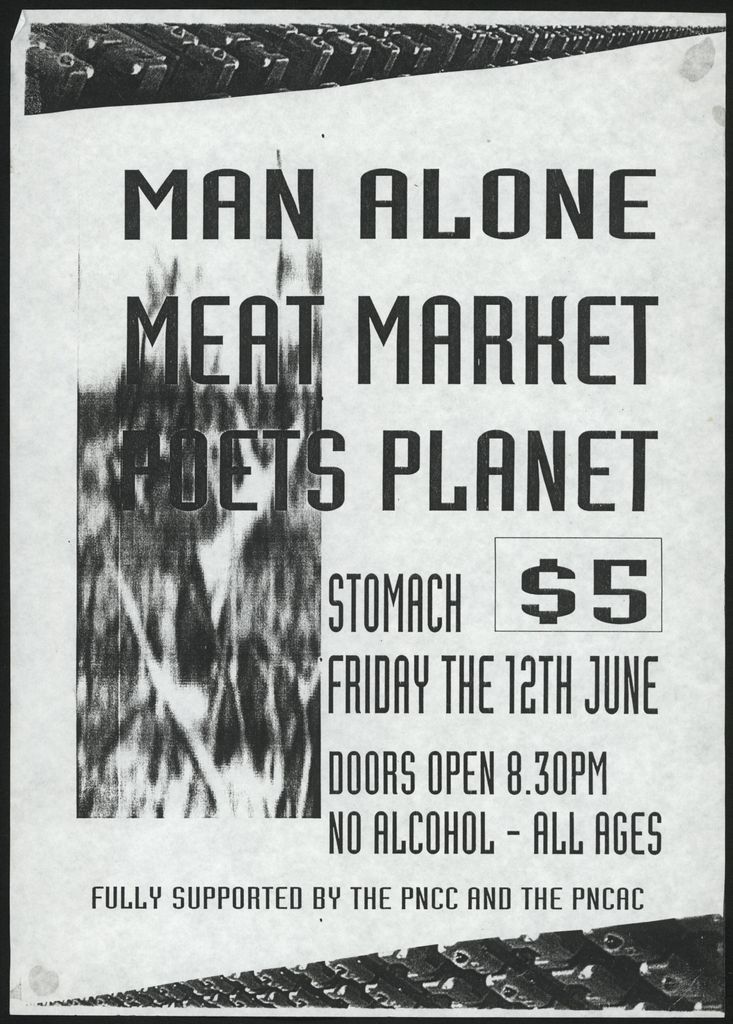 - Man Alone, Meat Market, Poets Planet. Stomach $5 Friday the 12th June. Doors open 8.30pm. No alcohol - all ages. Fully supported by the PNCC and the PNCAC.