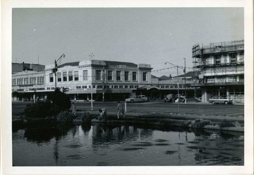 This photograph looks towards the corner of Fitzherbert Avenue and The Square. In the middle of the image, children can be seen playing in the Lakelet. It was the main feature of the last quadrant of The Square to be developed by the Beautifying Society. James Nash, Mayor of Palmerston North, opened The Lakelet on 27 October 1909. It is shaped as a butterfly, with the wings being bisected by a bridge as its body. It is also referred to as the Butterfly Lake. The building in the background is the old Palmerston North Municipal Library.