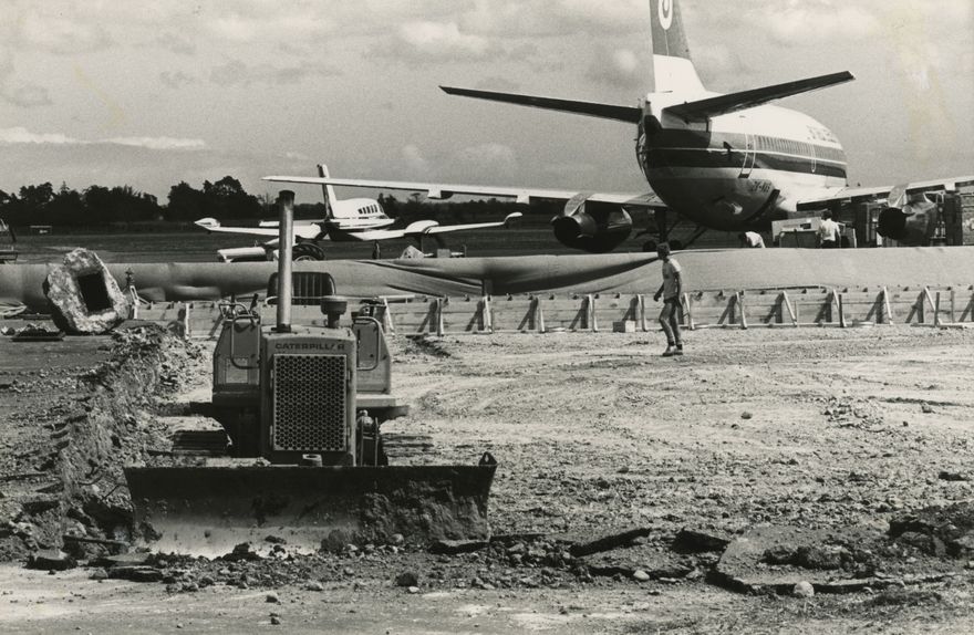 A Caterpillar bulldozer excavating the area in front of the airport terminal, for concreting. An Air New Zealand Boeing 737(on the right) and a commuter airline Cessna 402 are parked beyond. Photograph published in the Manawatu Evening Standard 12 March 1981.