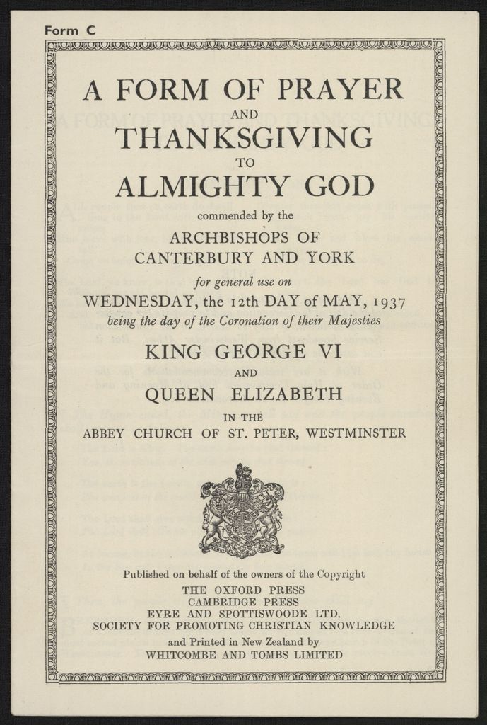 "A Form of Prayer and Thanksgiving to Almighty God commended by the Archbishops of Cantebury and York for general use on Wednesday, the 12th Day of May, 1937 being the day of the Coronations of their Majesties King George VI and Queen Elizabeth in the Abbey Church of St. Peter, Westminter."