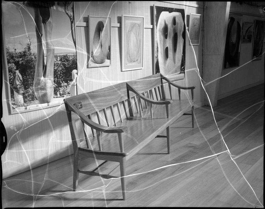 - This image was taken for a story that ran in The Manawatu Evening Standard on 30 May 1961 "This fine mahogany seat, designed by the noted Palmerston North sculptor, Mr. T.V. Johnston, and made by a city firm, has been presented to the Manawatu Society of Arts by the relatives and friends of the late Miss D. FitzHerbert. Of contemporary style, it is designed to harmonise with the interior of the city's Art Gallery in Grey Street. Miss FitzHerbert, a founder member of the society, was keenly interested in art and was an active member of the Palmerston North Art Group."