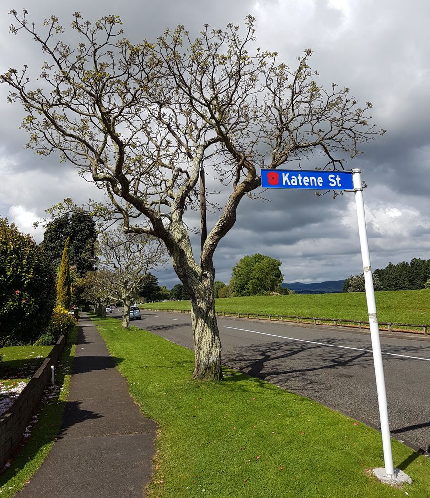 Photograph of sign with poppy denoting that the street was named after a New Zealand soldier who served overseas and that their story was accepted by the Poppy Places Trust. This street makes up part of the 2nd phase of the project in Palmerston North which commemorates nine members of the 28th Māori Battalion in the Awatapu subdivision. The signs were unveiled on Armistice Day, 11th November 2016. Prior to its subdivision, the land known as Awatapu was a golf course and grazing area situated next to the Manawatu River. In order to free up land for residential development and increase revenue, a Council meeting of 16 April 1963 resolved to subdivide the area via “disposal of sections through Land Agents at pre-determined figures fixed by the Council”. The new Awatapu College had to be allowed for, and the old Awatapu Golf Links shifted upstream to Brightwater Terrace, which then became the Palmerston North Golf Club. As part of the process of subdividing and naming streets, George Dittmer was contacted in late 1964 to give his thoughts on the naming of streets after 28th Māori Battalion soldiers as a commemoration of their service to their country. Dittmer provided a comprehensive list of soldiers who had served under him which was later utilised by the Council to adopt street names in the area in 1965. Poppy Places website.