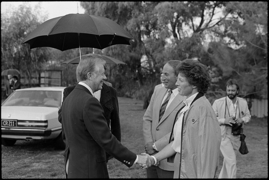 This image was taken by the Evening Standard on the 11th of February 1984 but was not published. It depicts former United States president Jimmy Carter and his wife Rosalynn visiting Highden Park - Herrick and Judy Perry's thoroughbred stud farm at Awahuri.