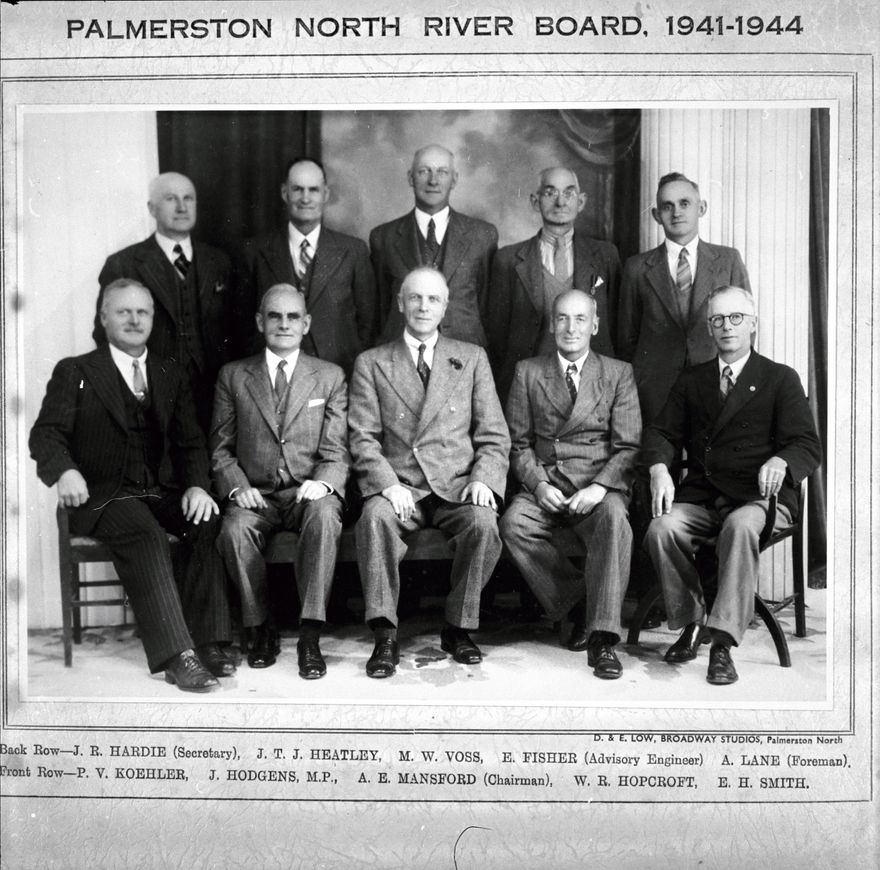 Thought to be the last Palmerston North River Board, 1941 – 1944, as from 1945 onward it became known as the Manawatu Catchment Board. Back row, from left: J R Hardie, J T J Heatley, M W Voss, E Fisher, A Lane. Front row, from left: P V Koehler, J Hodgens, A E Mansford, W R Hopcroft, E H Smith