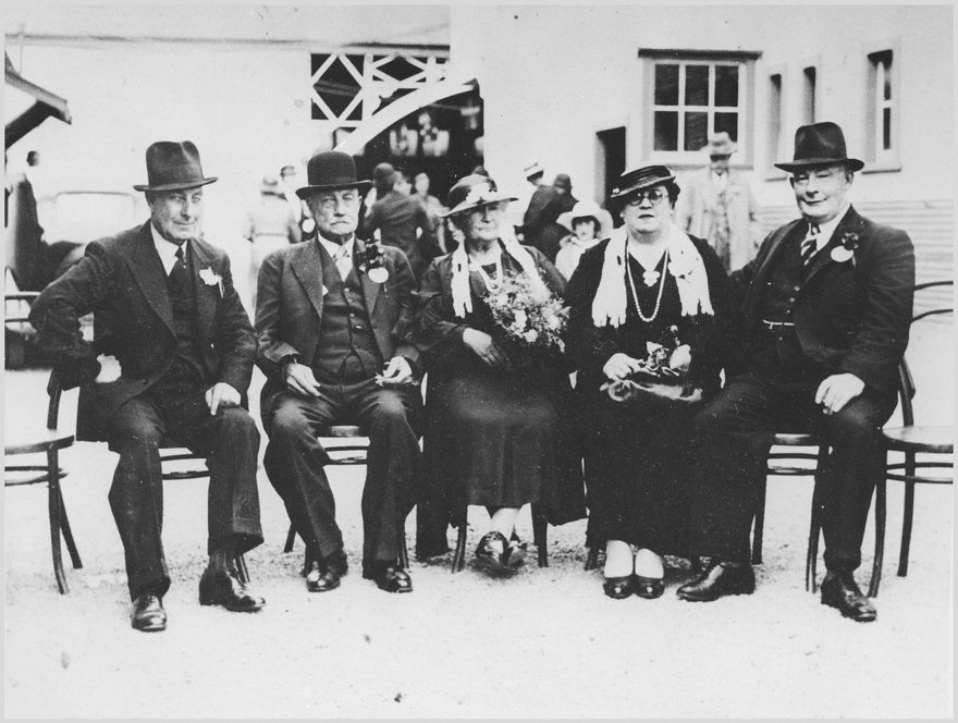 William Wood (1854-1943) was Mayor of Palmerston North 1895-1899 and 1901-1903, and Member of Parliament for Palmerston North from 1902-1908. Mrs Wood was involved in many community projects including beautifying the Square and setting up Palmerston North's first old peoples home (now Awapuni Hospitial). They had four sons and four daughters. From left to right: Mr Wood of Wellington (son); William Wood; Mrs William Wood; Mrs Herbert Wood (daughter-in-law); Herbert Wood (son).