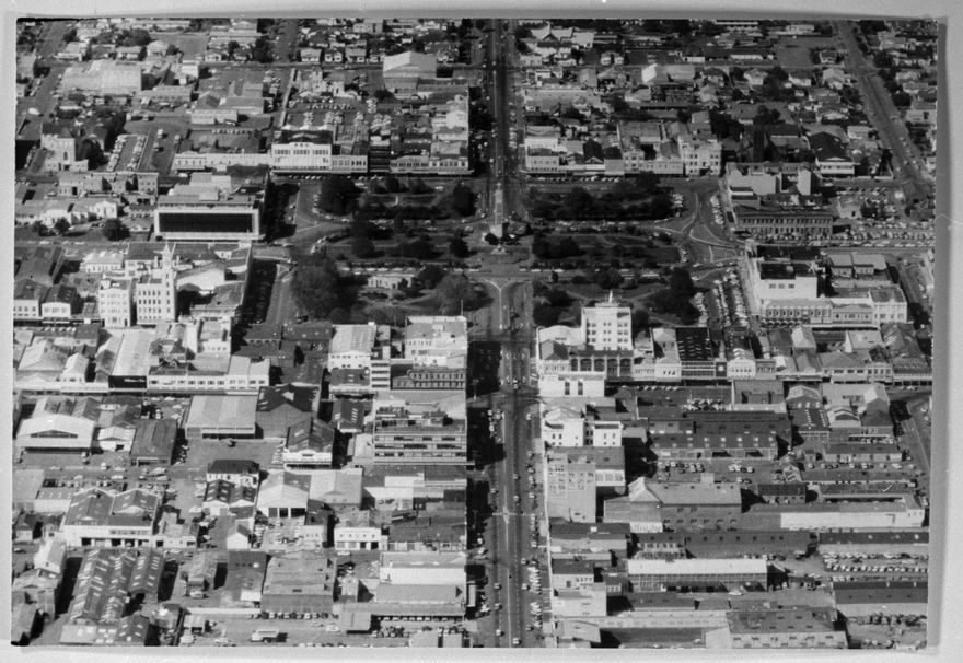 A view of Palmerston North Central City - including the Square, Main Street East and West, Fitzherbert Avenue (background) and Rangitikei Street (foreground).