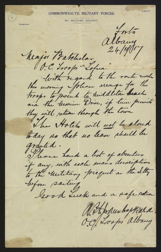 Letter to Major Arthur Batchelar as Officer Commanding troops on the ‘Tofua’, regarding a route march in Albany, Australia