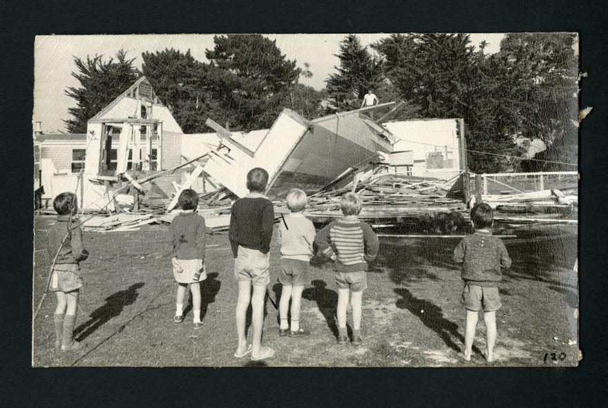 Six pupils watch the demolition of the former Fitzherbert East School building, which was 78 years old. Aokautere School (formerly known as Fitzherbert East School) was established in 1889.