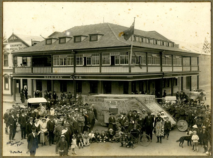 Part of the 'Final Battle Campaign for Sick and Wounded Soldiers' fund raising procession outside the Soldier's Club which was built at the corner of Cuba and George Streets by the Patriotic Society in 1917, later known as Returned Servicemen Association building. The Patriotic Society was created in 1916, during World War One, for fund raising and welfare purposes. This fund raiser ran 25 February 1918 for 3 to 4 weeks, raising 20 thousand pounds. The town of Palmerston North and outlying districts were divided into fundraising areas, with groups being given military names. Palmerston North had four such groups, named the Western Grenadiers, Northern Fusiliers, Eastern Guards and Southern Bombardiers. On 27 February a monster procession was held, with decorated cars and motorbikes, the tank pictured was an entrant in that procession. Other fund raising activities included a Monster Art Union, with prizes including a 500 pound Buick car (Flaxmillers Association), 200 pound land sections at Levin (Keiller Bros. & Mrs Geoffrey Potts), a 200 pound racehorse (Leo Collinson of Collinson & Cunninghame, a keen racing man), a gig from Bett & Bayly, a spring dray from Adam Burges, a Jersey bull from Mrs Geoffrey Potts, unbroken horses, and various shop goods such as a chesterfield couch, typewriter and wedding cake valued at £3. There was also a Princess Carnival, giant garden party at the Nathans, a concert, school sports competition, casino night and children's fancy dress ball.