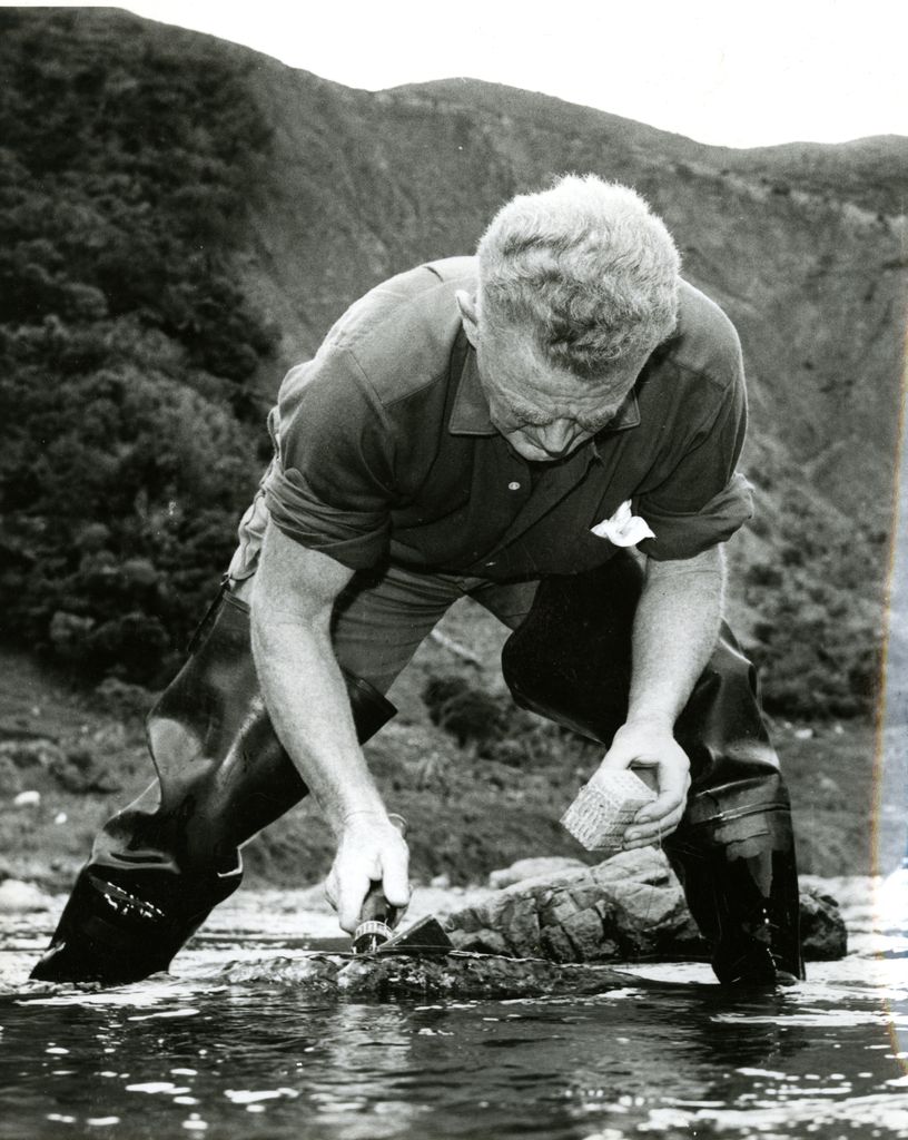 - This image was published in an article in the Manawatū Daily Times on 18 September, 1962. "Mr. [L.L] McMillan, prepares a small hole in the gravel riverbed of the Kahuterawa River in the Tararua Ranges behind Linton. The liberation is for the 1964 seaspn." The image and caption accompany an article regarding the Wellington Acclimatisation Socity's work with the trout fishery.