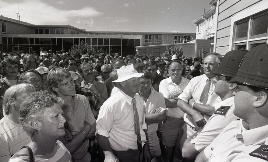 This series of images was taken for a story that ran in on the front page of The Manawatu Evening Standard on 10 February, 1987. The story pertains to the mortgagee auction of a farm owned by Paul Geurtjens of Bulls. Up to 700 protesters attended the auction at Harcourts real estate on Fitzherbert Avenue. Auction proceedings were interrupted by protesters placing false bids and drowning out proceedings. The property was not sold as it didn’t raise a bid. The images of Longburn workers protesting appear on the same roll of film, however it is unclear if theese are from the same event.