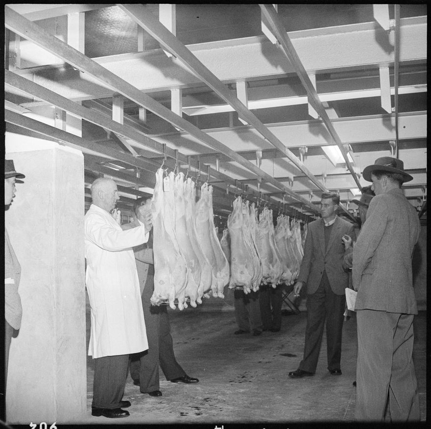 This image was taken for a story that ran in The Manawatu Evening Standard on 07 November 1960 "Mr. S. Smith-Pilling, supervising grader to the New Zealand Meat Board, is seen judging the Show lamb carcases at the Longburn Freezing Works today. On the right of the photograph are some farmers watching the judging."