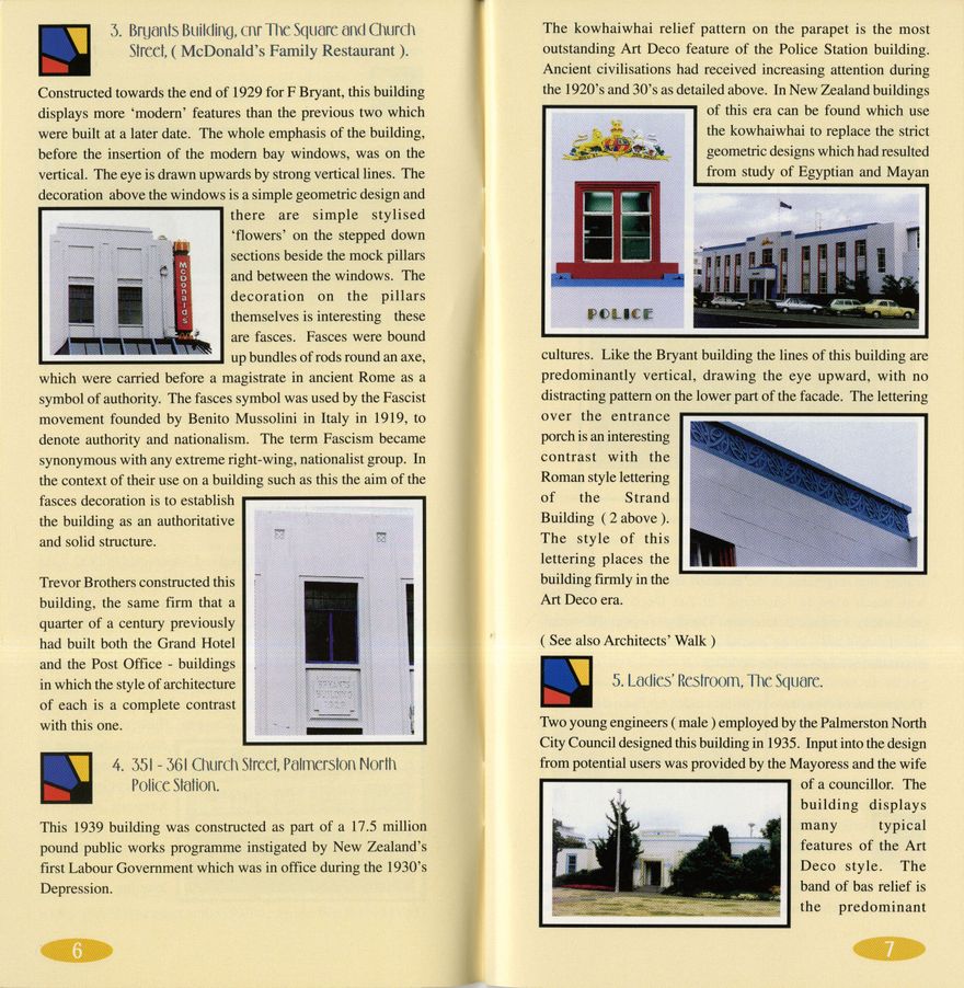 This walk was first developed by Pamela Benson and Dale Bailey in 1993. Benson subsequently undertook further research. This interpretation of the material was compiled by Dorothy Pilkington in 1994. Undercover Art Deco was printed in the same booklet as the Architects Walk Heritage Trail, which is also available on Manawatū Heritage 2025Pa_A175-375_043641_001.