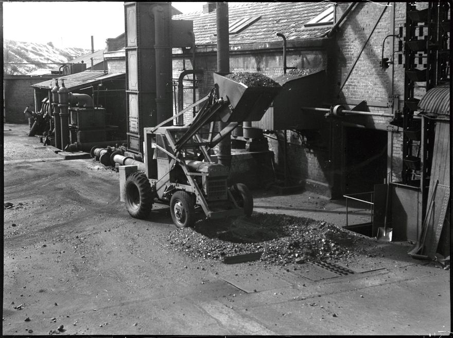 A Niven Engineering built shovel fixed to this tractor shifts coal at the Palmerston North Gas Works.