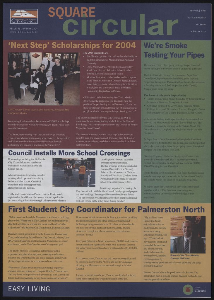 The Square Circular was Palmerston North City Council's monthly community publication, informing Palmerstonians of PNCC initiatives, activites, and events. This month's issue includes: scholarships; school crossings; drainage pipes testing; student city co-ordinator; Duncan McCann; Caccia Birch House; notable trees; archives; central environmental laboratories; Friends of Manawatu; heritage trust; cycle lanes; road safety; Warren de la Haye; events funding; free concerts.