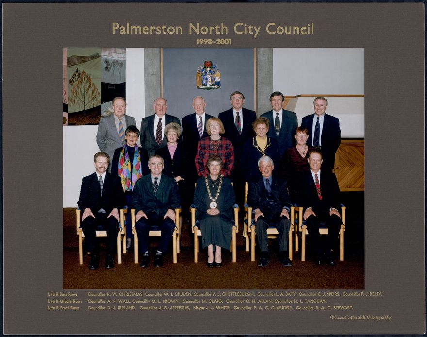 Front row: Cr D J Ireland; Cr J G Jeffries; Mayor J J White; Cr P A C Claridge; Cr R A C Stewart.