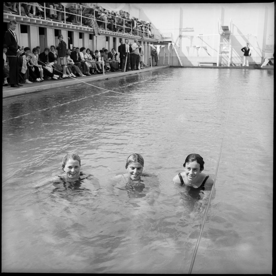 This image was taken for a story that ran in The Manawatu Evening Standard on 21st March, 1963. "Yet another record to Miss Vivien Haddon (centre) of the Freyberg High School. At the North Island secondary school swimming championships held in Palmerston North on Saturday Miss Haddon broke the record by 2sec, making the time 2min. 59sec."