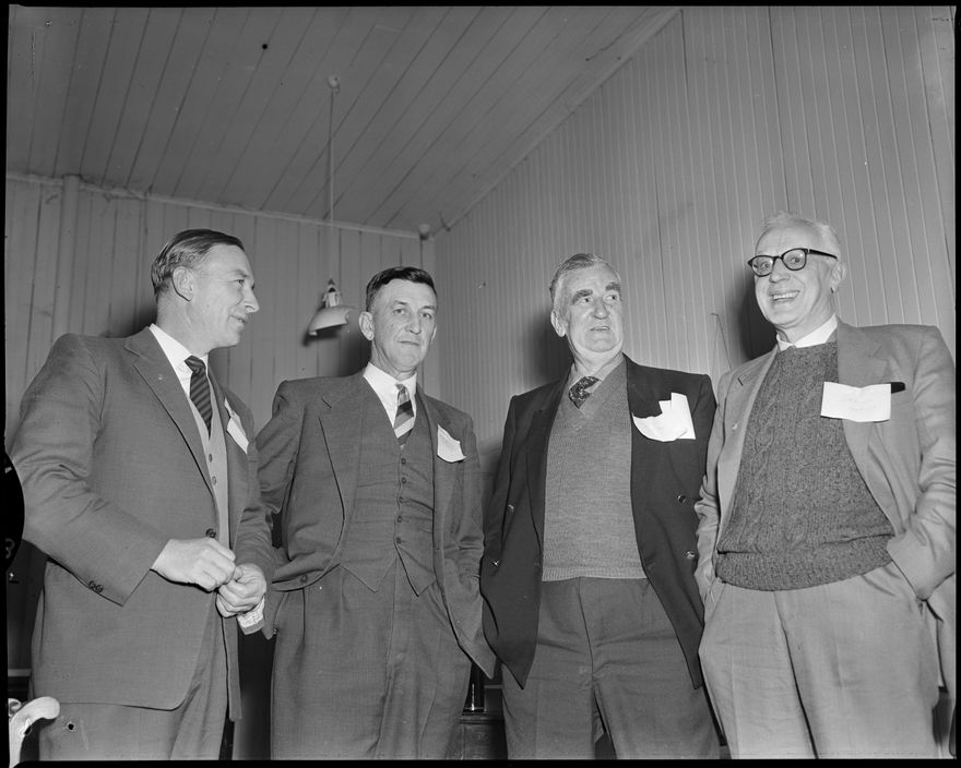 This image was taken for a story that ran in The Manawatu Evening Standard on 11 August 1960 "Members of the Palmerston North branch of the Napier Boys' High School Old Boys' Association held a reunion last night at the National Party rooms. Events during their schooldays were recalled by many of those present, especially by this group who had much in common. From left are Messrs E.W. Norman (1917-20), H. Essex (1905-11), and W.B. King (1907-11). Mr. Essex was the oldest old boy at the reunion."