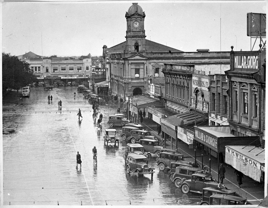 This photograph of The Square looks along the eastern side of The Square, from near the Church Street corner, past Main Street to Broadway. The building in the centre is the Post Office on the corner of Main Street. While this building still stands [2014], the clock tower was removed in 1942 after the Wairarapa earthquake.