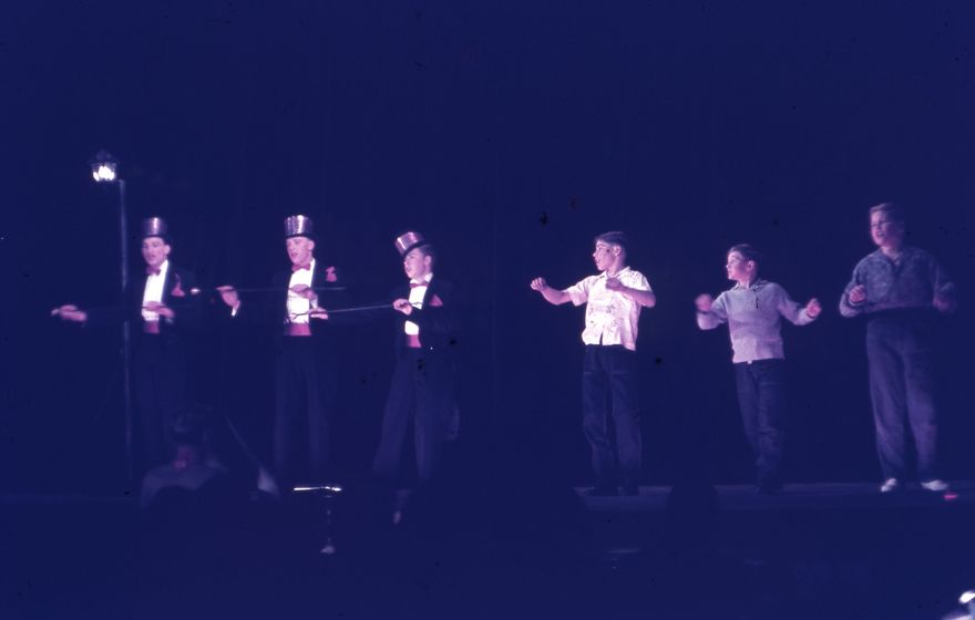 This image depicts senior scouts in top hats, red bow ties and tails dance with canes while younger scouts watch and try to mimic the steps.