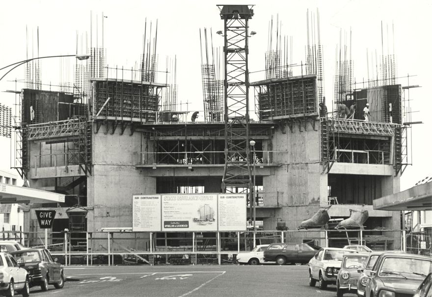 This building was constructed during 1981 by McMillan and Lockwood, and completed April 1982. The cost of building was approximately $8 million. View taken looking down Queen Street to Rangitikei Street.