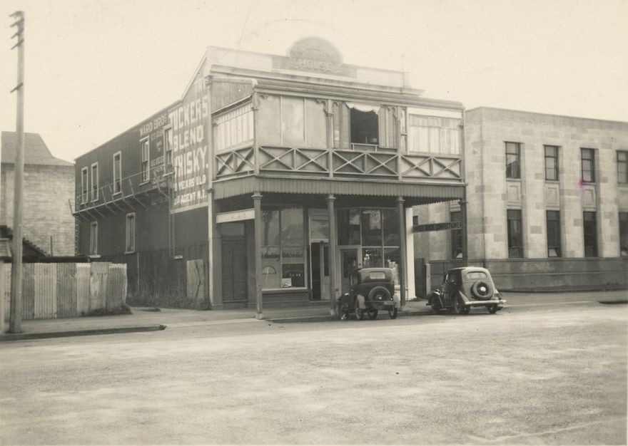 This building appears to have served as Tuckers' wine merchant business until the 1940s. The two shops on the street fronage are the Sweet Nook Confectionery and P Hosking, Watchmaker, and directories would suggest they operated next to each other for a short time around 1950. At that time Devonshire House was a boarding house run by Mrs Clark. The Police Station, built 1939, can be seen to the right.