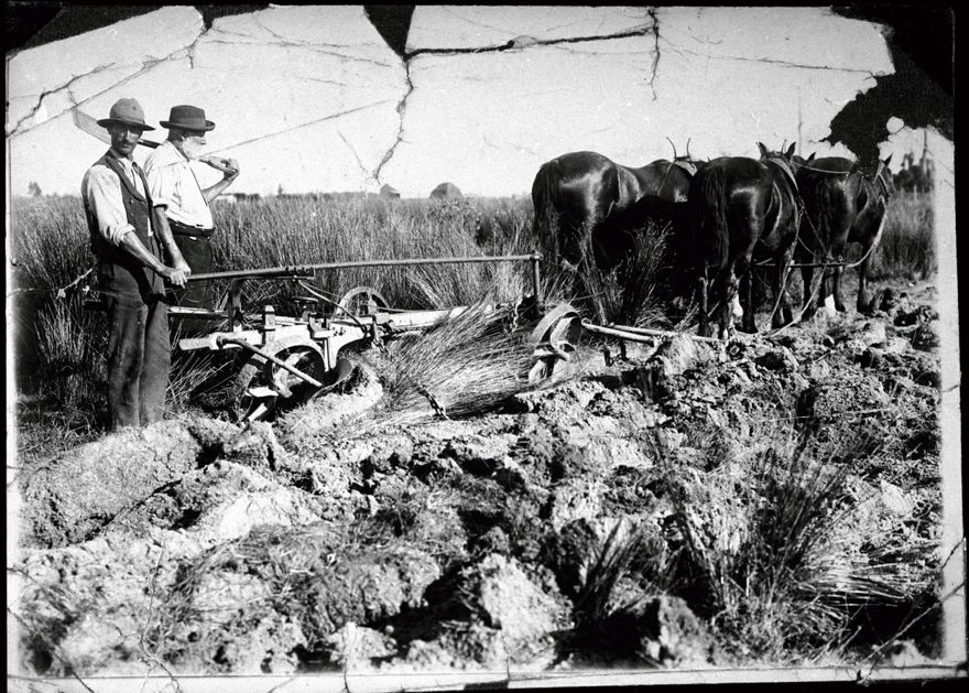 The original photograph has “breaking in the land at Aorangi” written on the back. The plough in use is a heavy swamp plough, with a chain attached to the shear. The chain assisted in turning the rushes under the sod. The man on the far left is thought to be a member of the Jefferies family of the Aoranagi – Taonui area.