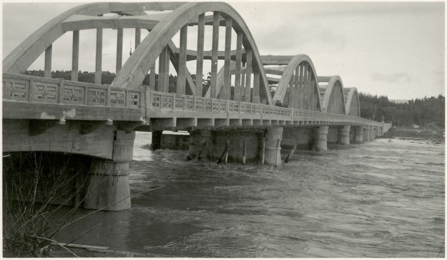 The Manawatu River appears to be in flood in this photograph. Scaffolding is still in evidence so presumably the photographs were taken just prior to the official opening in July 1935. This replaced the original structure built in 1877. It was constructed by Fletcher Construction and remained until 1986 when it proved too small for the volume of traffic, particularly as it serves the main route to Massey University.