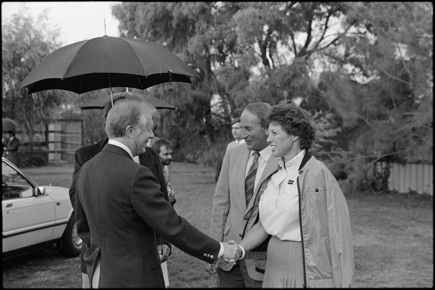 This image was taken by the Evening Standard on the 11th of February 1984 but was not published. It depicts former United States president Jimmy Carter and his wife Rosalynn visiting Highden Park - Herrick and Judy Perry's thoroughbred stud farm at Awahuri.