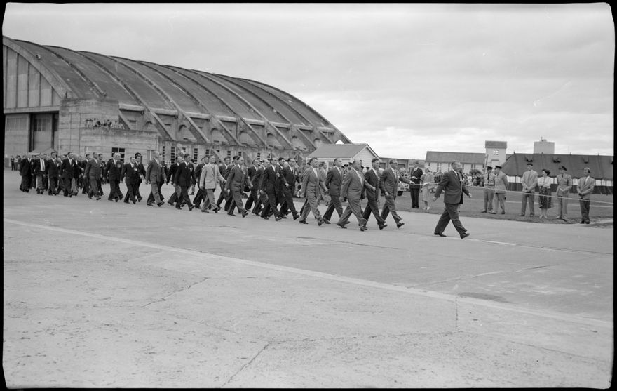 This image was taken for a story that ran in The Manawatu Evening Standard on 01 April 1958 : "Men of No. 75 Squadron Association march smartly from behind one of the hangars on Saturday to the tarmac where they made a presentation of a model of a Wellington bomber to No. 75 Squadron at the opening ceremony before the display."