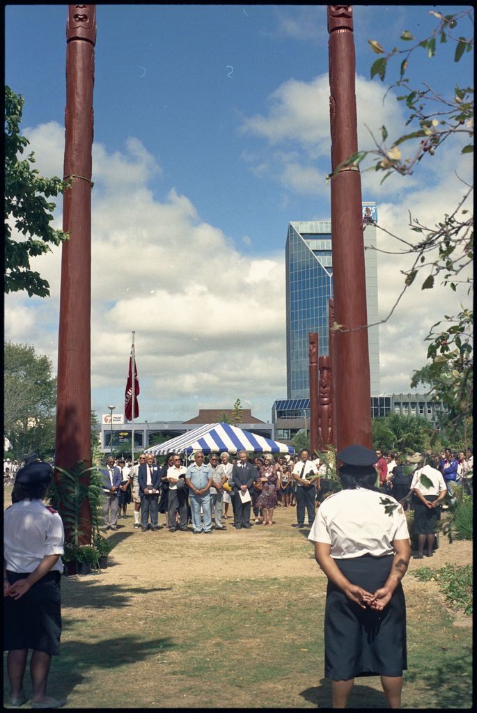 Images from the re-dedication of Te Marae o Hine on Saturday, 3 March, 1990. The following notes were written by City Archivist, Ian Matheson, around the time of the re-dedication. Background: Te Marae o Hine is that part of The Square on which stands the statue of Te Peeti Te Awe Awe and the City Council building. The name, The Courtyard of the Daughter of Peace was offered to Te Peeti Te Awe Awe one hundred and eleven years ago by Matene Te Whiwhi, Paramount Chief of Ngati Raukawa in memory of his ancestress, Rongorito, a famous peacemaker who lived in Waikato thirteen generations ago. Te Peeti Te Awe Awe received the name and offered it to the first Mayor of Palmerston North, George Snelson in the hope that there would be peace between all citizens of Palmerston North. 1990: The City of Palmerston North has commissioned a set of 9 great carvings to be placed in that part of The Square called Te Marae o Hine to form a gathering place for all people. The people of Rangitāne, tangata whenua of this area have imbued these taonga with their mana. They stand as a memorial to Rongorito and a tribute to the vision of Te Peeti Te Awe Awe, Matene Te Whiwhi and George Snelson.