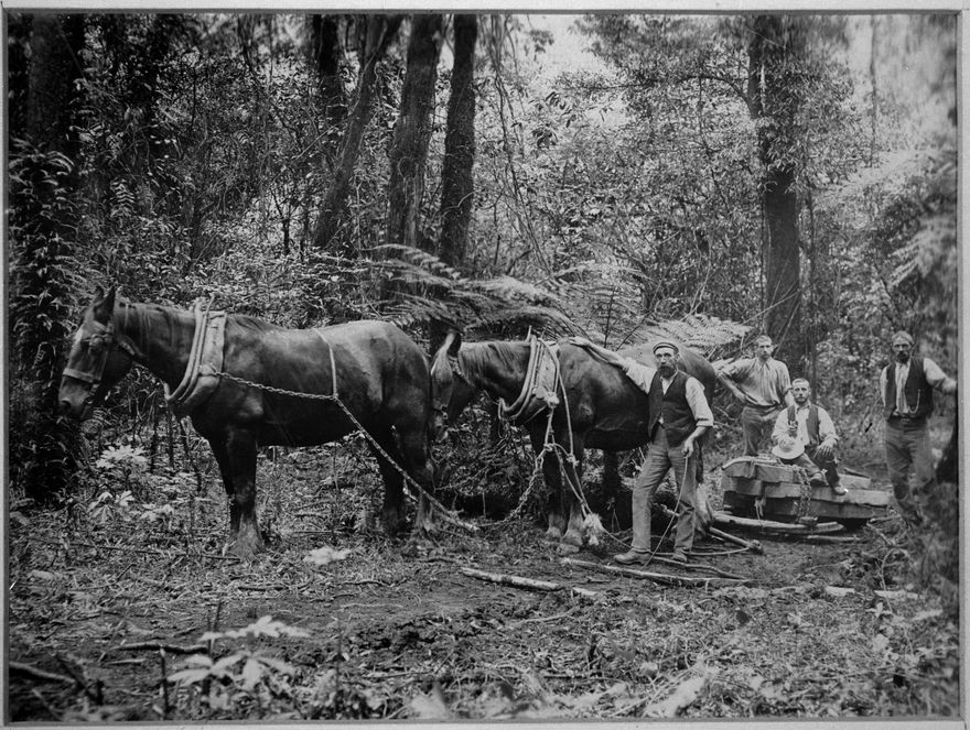 The photograph was taken a few chains south-west of Opawe Road and shows the squared sleepers being sledged out of the bush to the road. The owner and driver of the horses and sledge was Mr. Sam Lane. The men in the photo are, from left to right: Sam Lane; George Wagstaff; Ernest Wagstaff (sitting); and unknown.