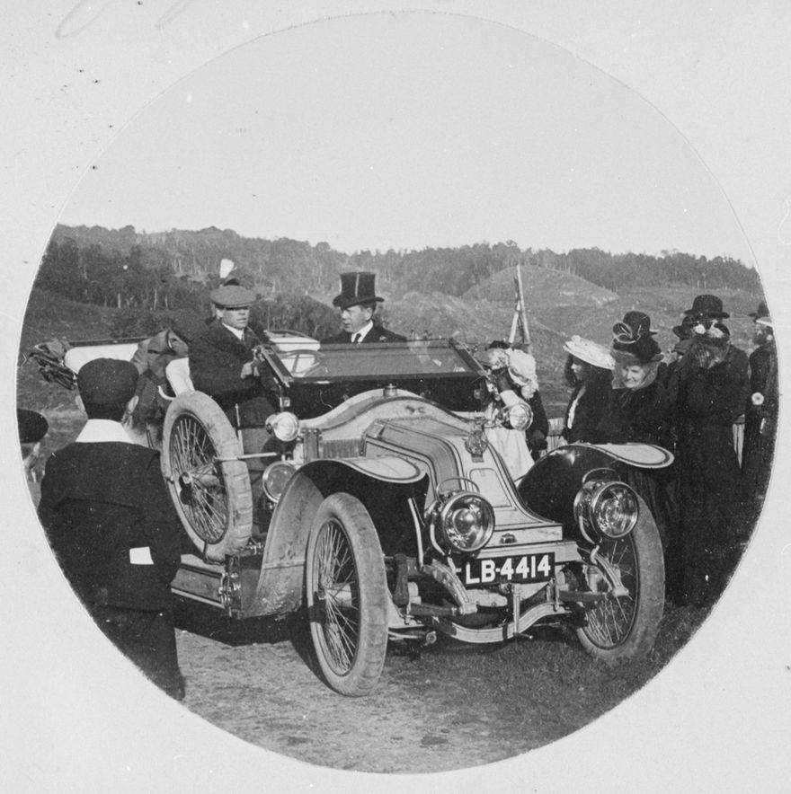 Dignitaries at the opening of the 2nd Ashhurst Bridge. The original bridge was washed away in the 1895 flood and due to disputes a new bridge was not built until 1909. In the intervening period a punt was used to ferry vehicles and passengers across the Manawatu River. The 2nd bridge was replaced with a concrete structure in 1969.