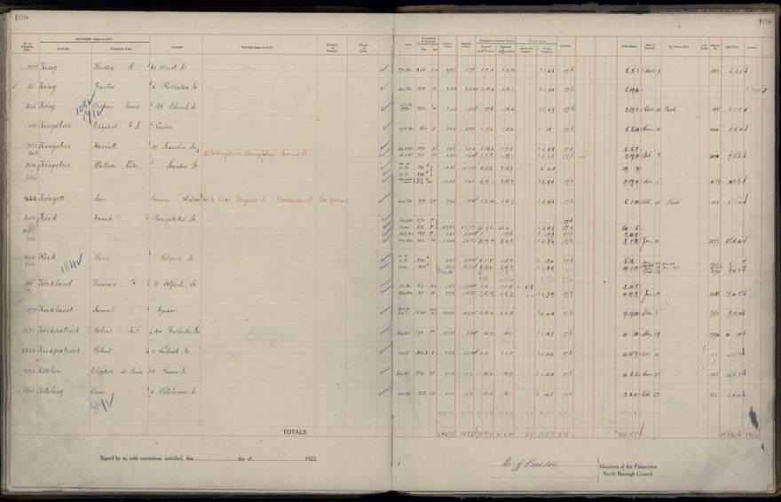 Palmerston North Borough Council rate book, listing rate payers for the years (1 April - 31 March) 1922 - 1923. Gives names, street, owner (if different to rate payer), legal description of property, capital and unimproved values and rates paid.