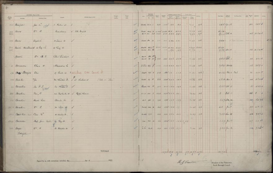 Palmerston North Borough Council rate book, listing rate payers for the years (1 April - 31 March) 1922 - 1923. Gives names, street, owner (if different to rate payer), legal description of property, capital and unimproved values and rates paid.