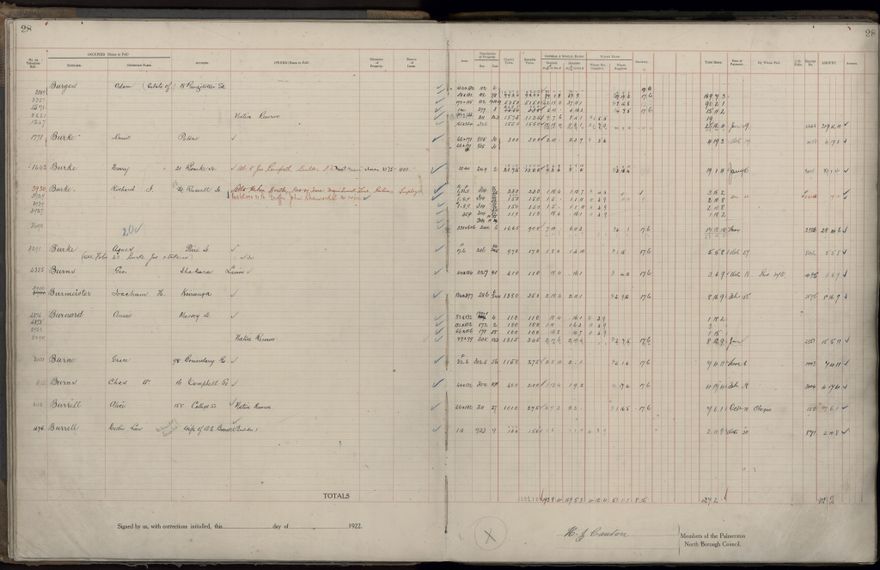 Palmerston North Borough Council rate book, listing rate payers for the years (1 April - 31 March) 1922 - 1923. Gives names, street, owner (if different to rate payer), legal description of property, capital and unimproved values and rates paid.