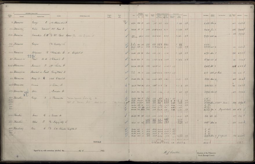 Palmerston North Borough Council rate book, listing rate payers for the years (1 April - 31 March) 1922 - 1923. Gives names, street, owner (if different to rate payer), legal description of property, capital and unimproved values and rates paid.
